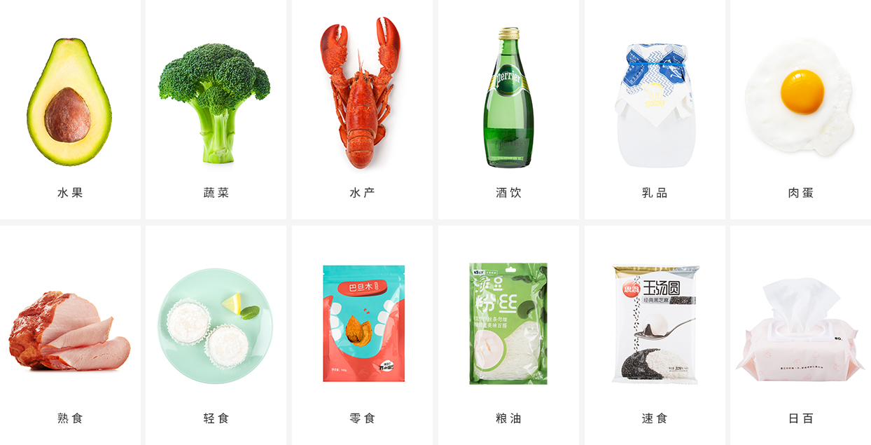 水果、蔬菜、肉蛋、水产、乳品、零食、酒饮、熟食、轻食、速食、粮油、日百